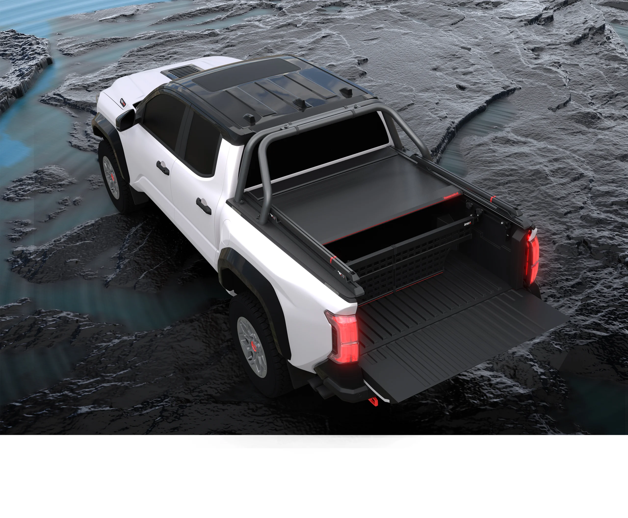 Rails latéraux spécialement conçus (épaisseur : 5 mm), qui suivent à 100 % la forme et le design des parties de rail du coffre (en longueur et en largeur). En conséquence, cela offre une meilleure isolation contre les intempéries et une procédure d'installation solide et durable pour tous les types d'arceaux de sécurité, de mains courantes latérales et de barres de chargement pour un usage intensif. Il vous offre également la possibilité de le combiner avec des accessoires d'origine (OEM), tels que des arceaux de sécurité.